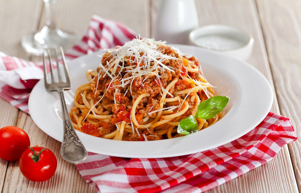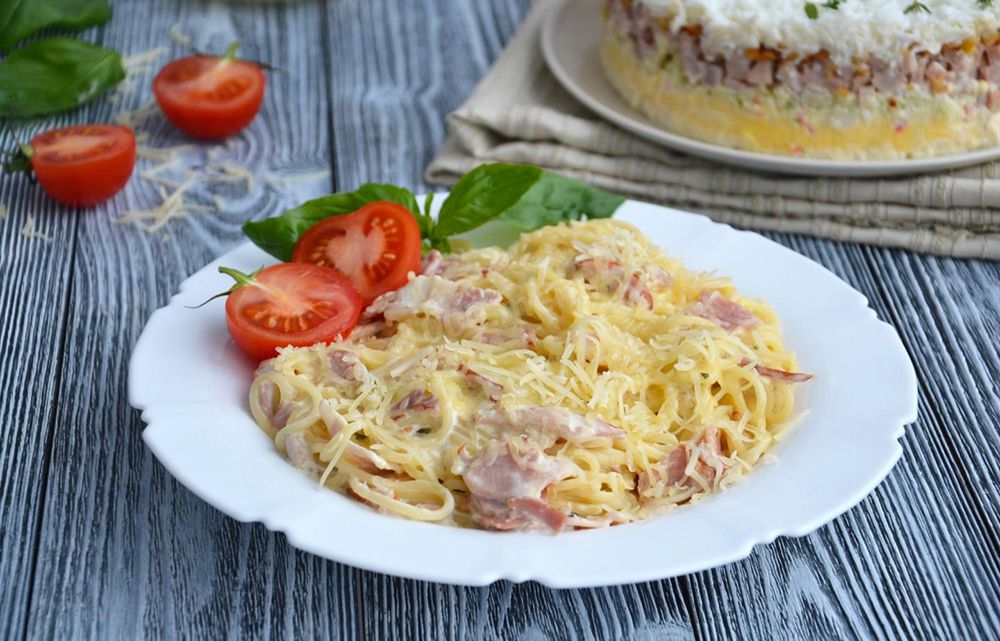 "спагетти, бекон, сливки, пармезан, белое вино, черри, яичный желток, базилик, чеснок, специи"