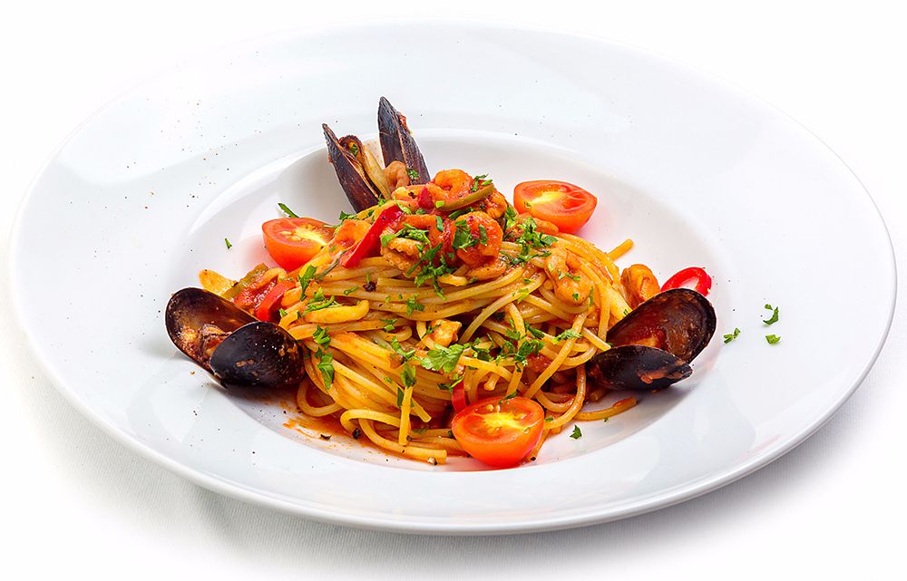 "феттучини, креветки тигровые, мидии киви, гребешки, черри, томат, пармезан, лимон"