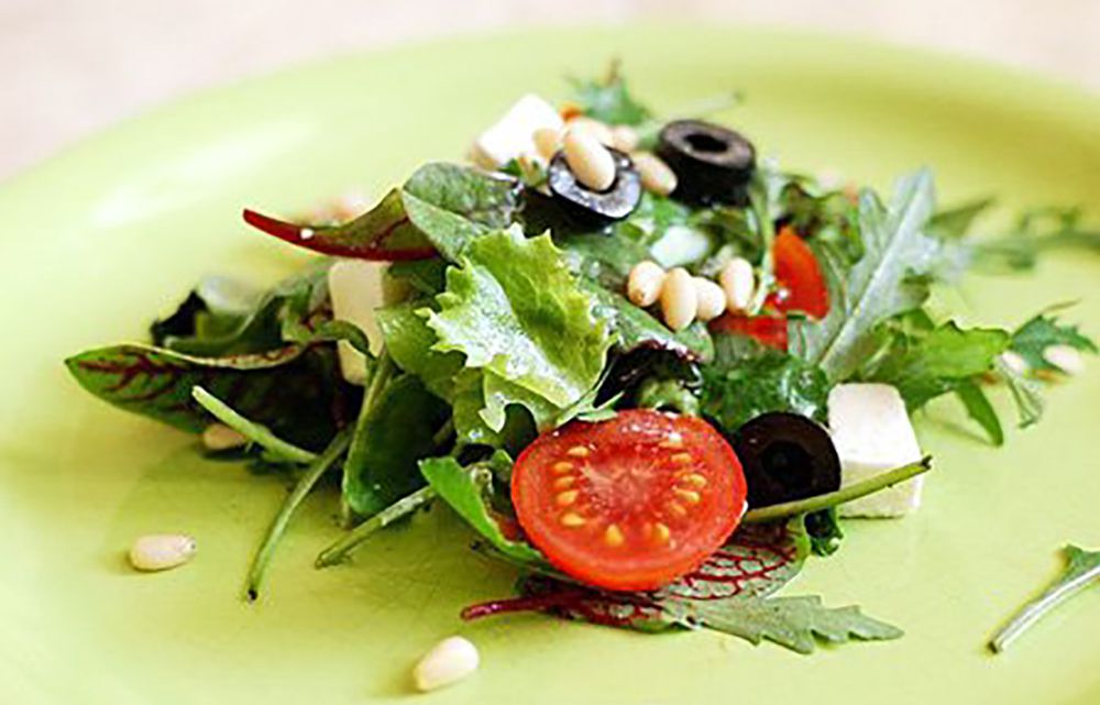 "свежая зелень, сыр Фета, помидоры Черри, маслины, корзинка из Пармезана"