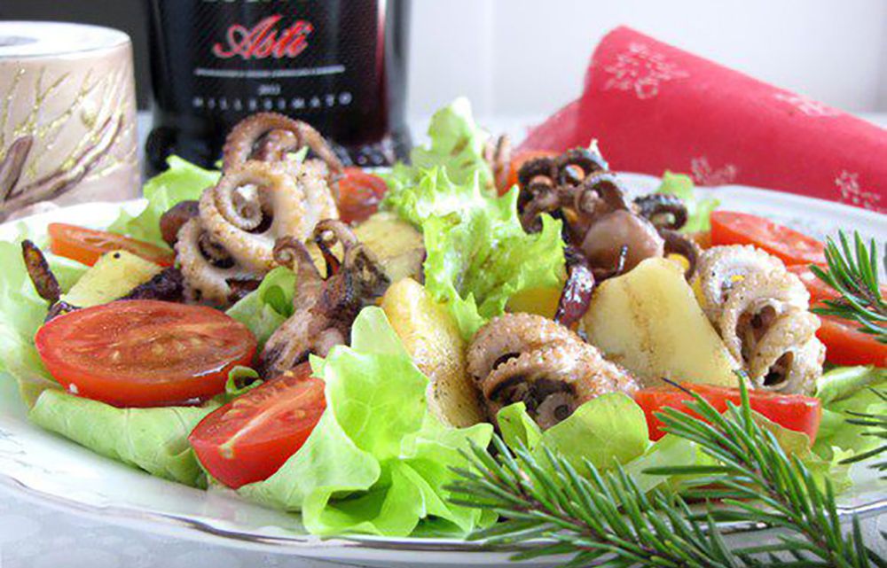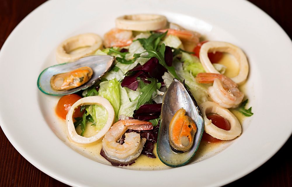 "кальмары, креветки, мидии, пармезан, черри, чеснок, микс салатов, лимон, соус Альфредо"