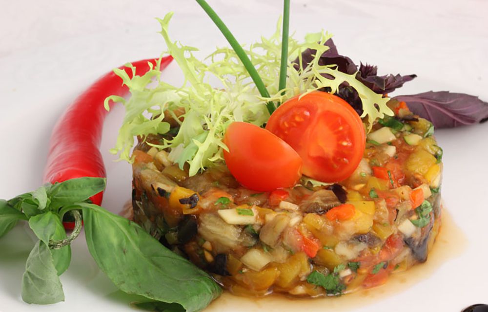 "мелко рубленые баклажаны, помидоры, перец болгарский на гриле. Лук красный, зелень, масло оливковое"