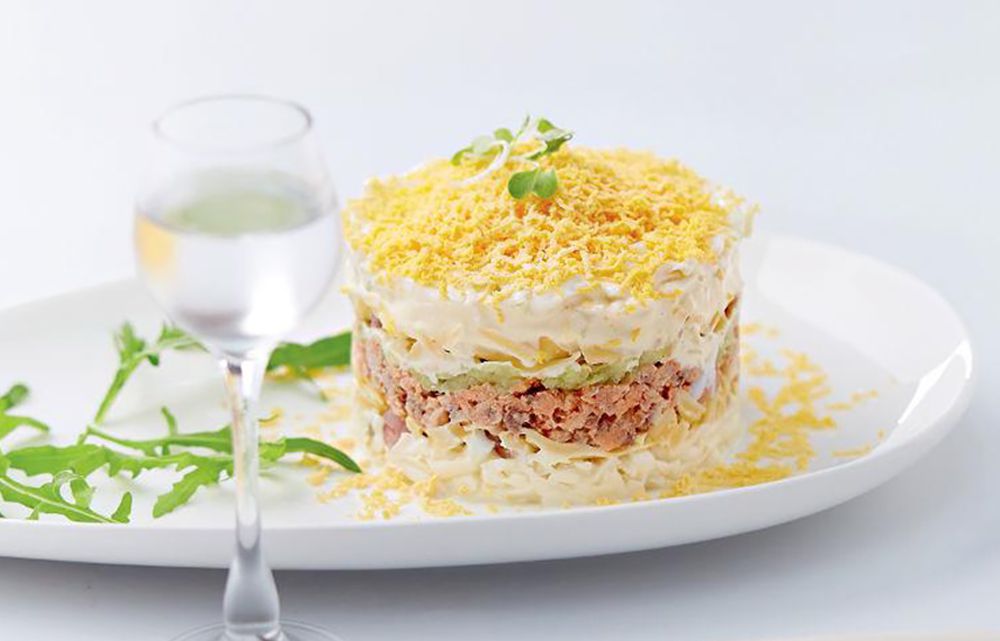"картофельный пай с соленым огурцом, куриным филе, перепелиными яйцами и майонезом"