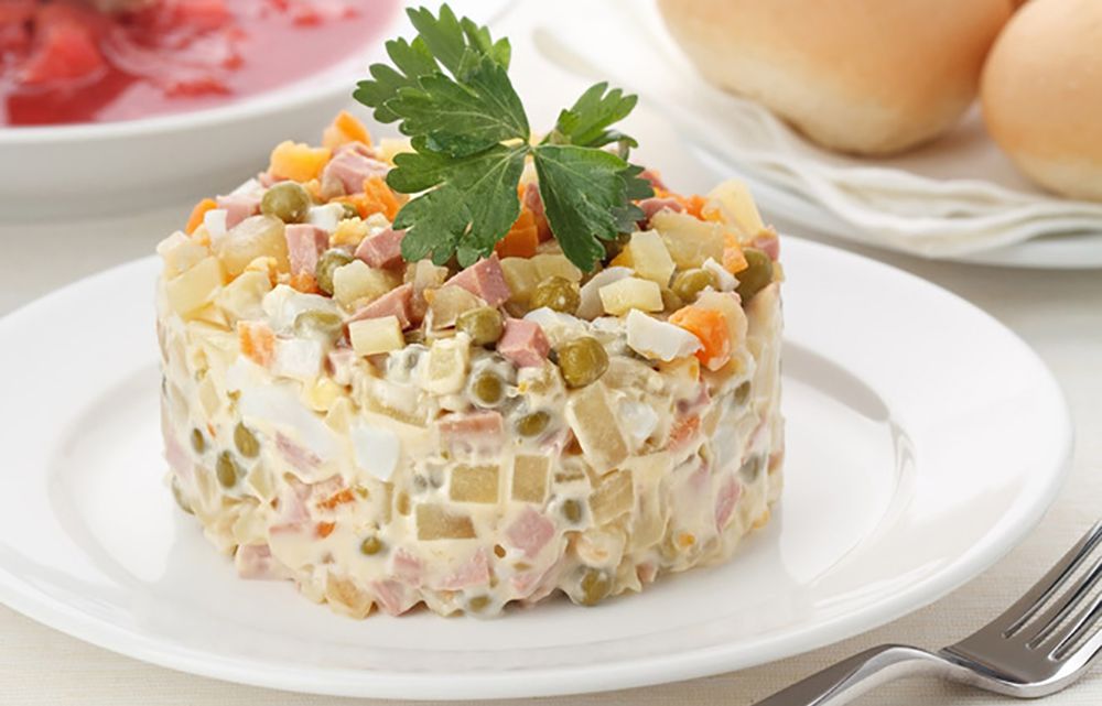 "говядина, картофель, морковь, горошек, яйцо, огурец свежий, майонез"