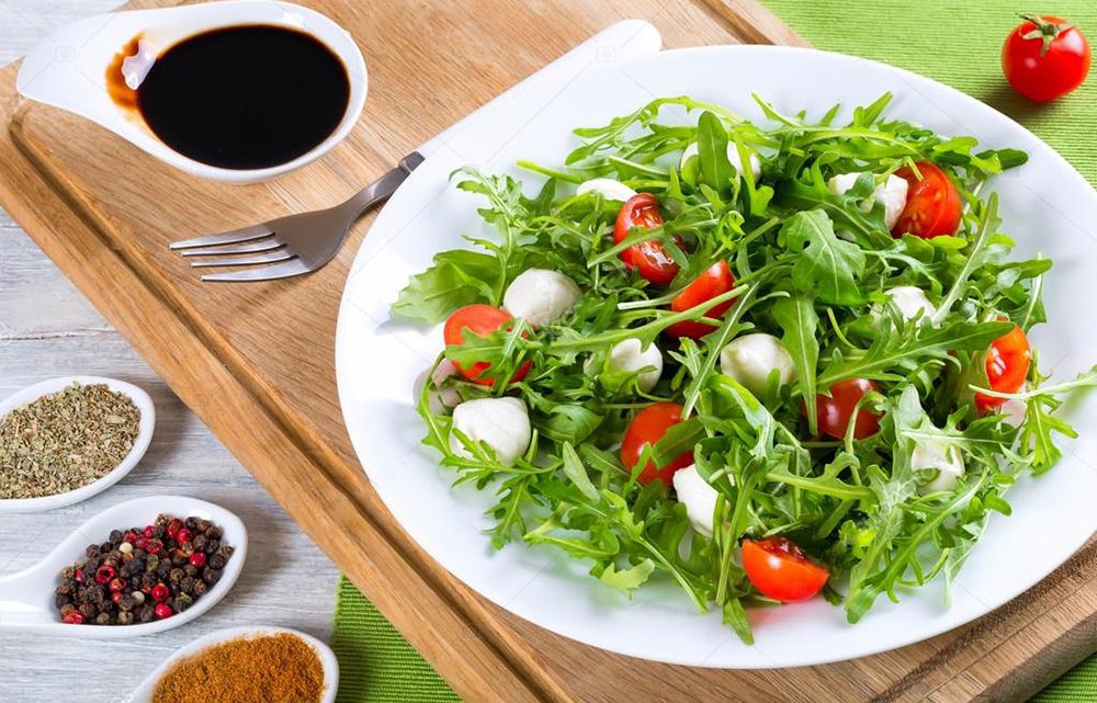 "руккола, мацарелла и кедровые орехи заправленные бальзамическим соусом с оливковым маслом"