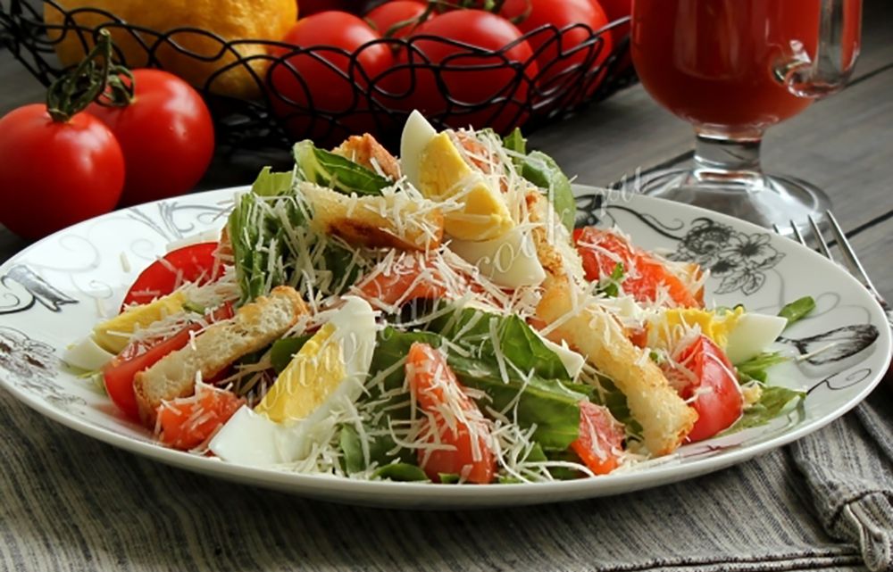 "семга слабосоленая, айсберг, романо, пармезан, черри, соус "Цезарь", гренки"