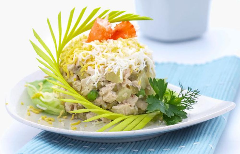 "куриная грудка, картофель, морковь, горошек, яйцо, огурец свежий, майонез"